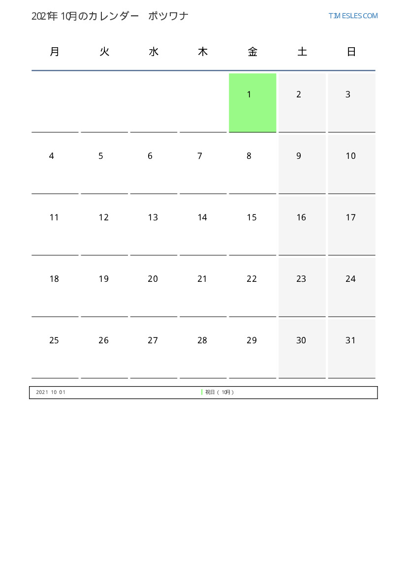 ボツワナ向け2021年10月の休日と週末のカレンダー
