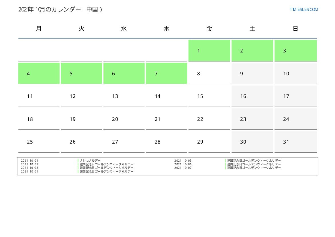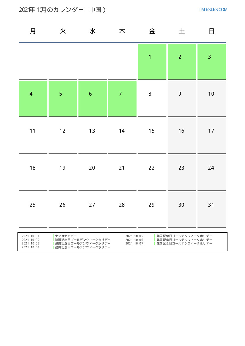 中国向け2021年10月の休日と週末のPDFカレンダーをダウンロードして印刷します