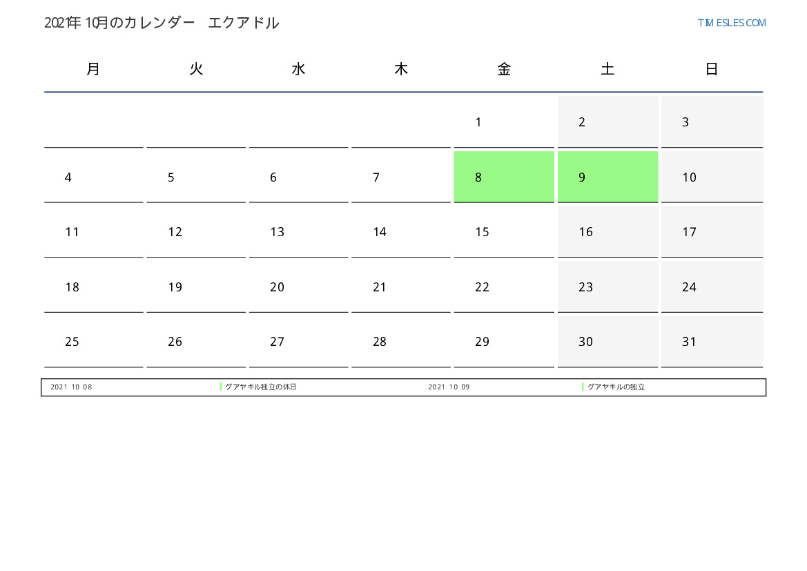 エクアドル向け2021年10月の休日と週末のカレンダー