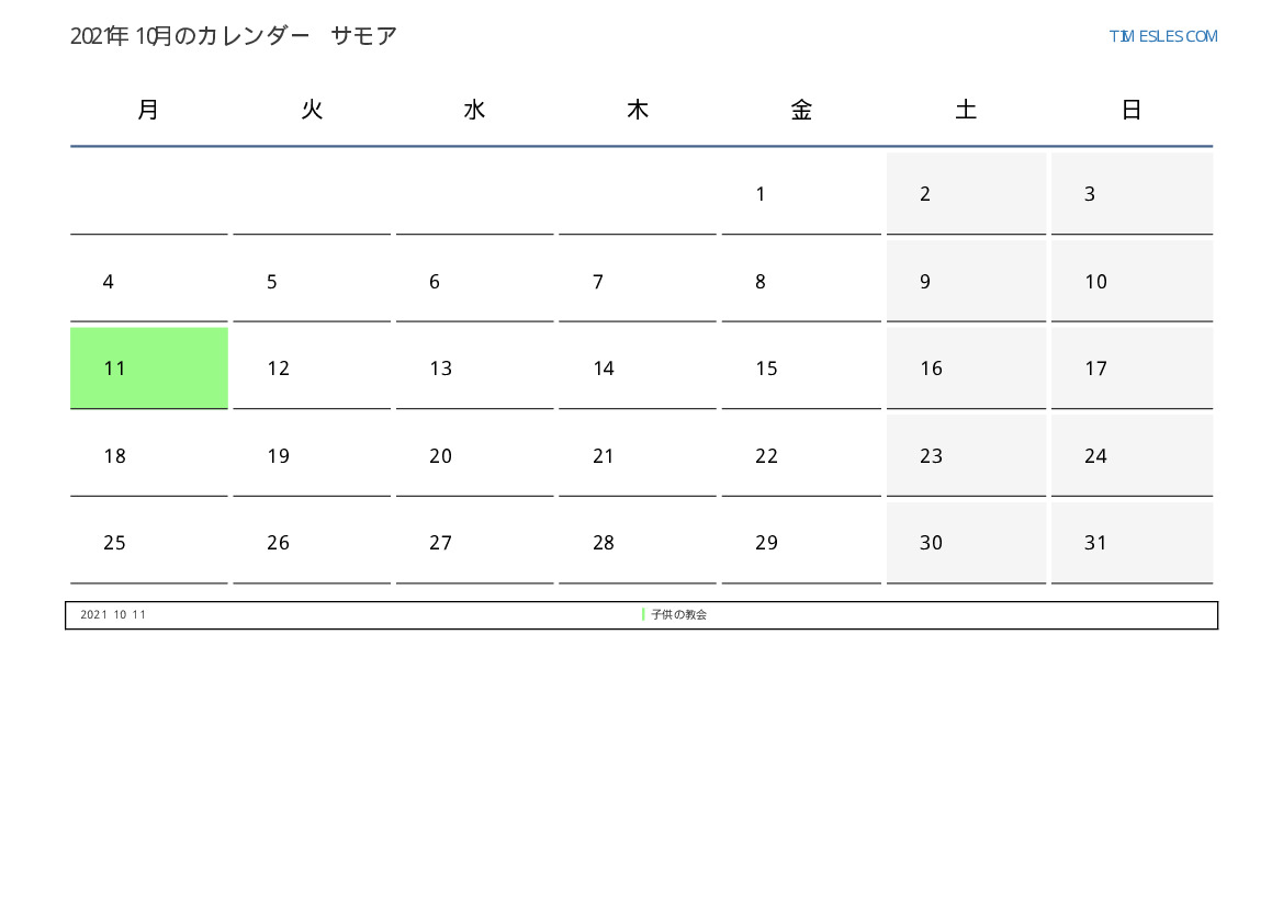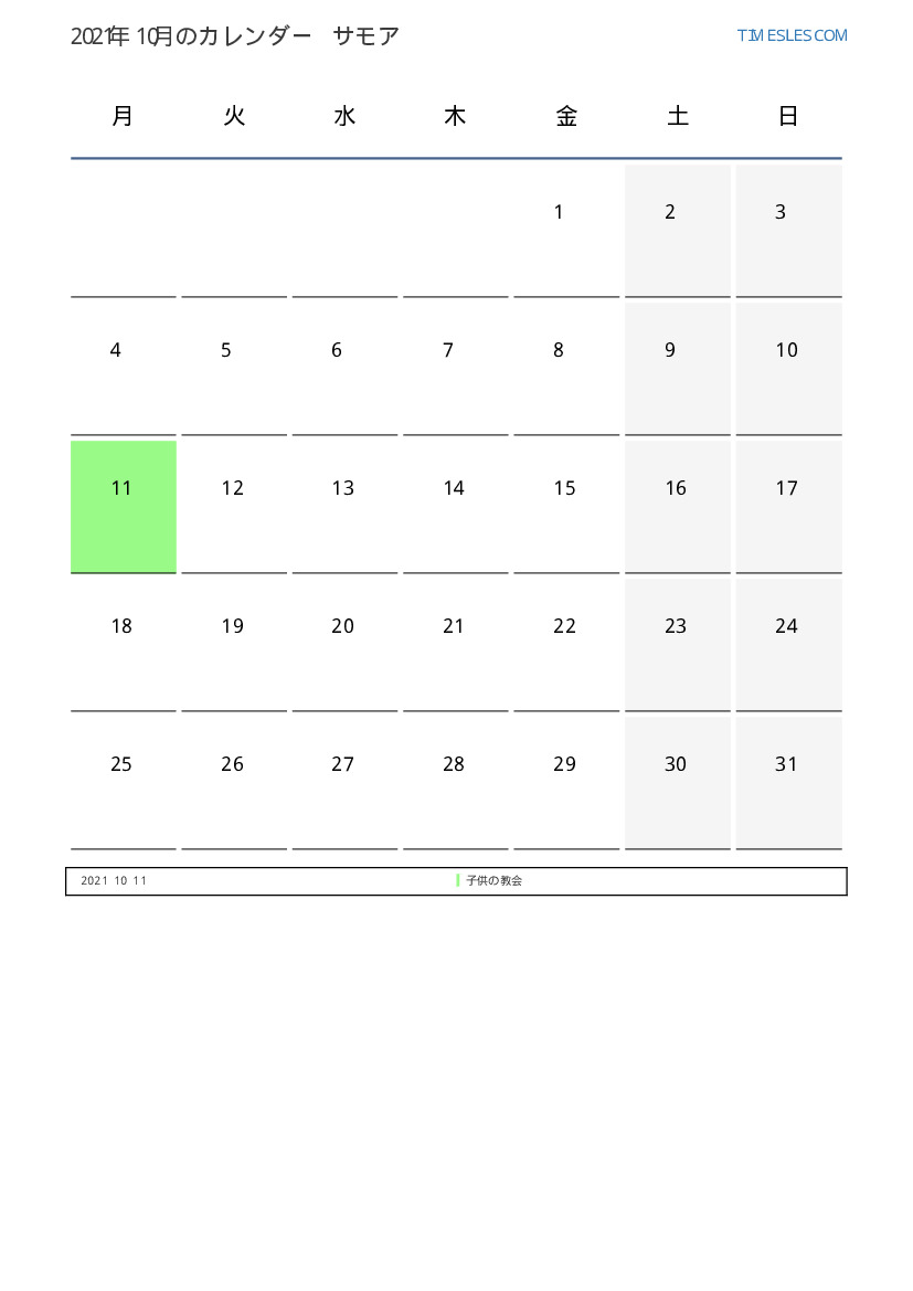 サモアのために2021年10月の休日と週末のPDFカレンダーをダウンロードして印刷します