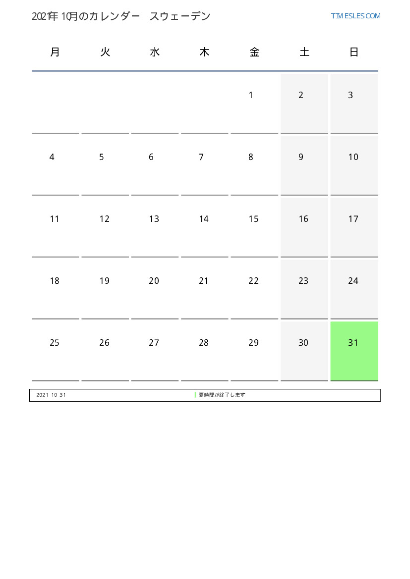 スウェーデン向け2021年10月の休日と週末のカレンダー