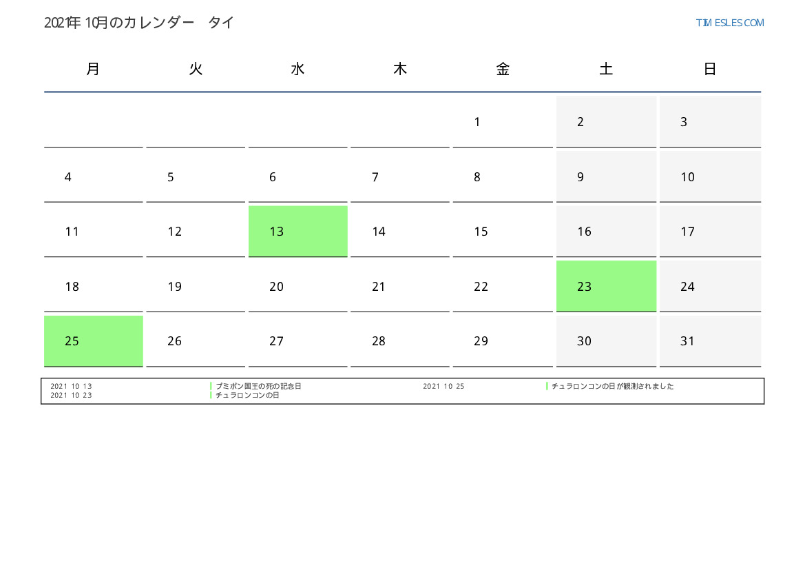 タイ向け2021年10月の休日と週末のPDFカレンダーをダウンロードして印刷します
