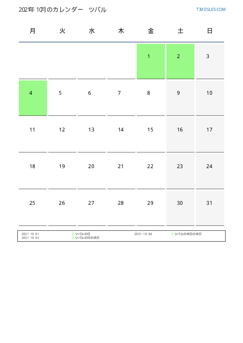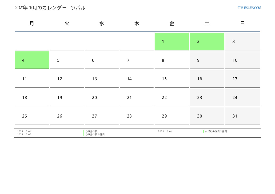 ツバル向け2021年10月の休日と週末のPDFカレンダーをダウンロードして印刷します