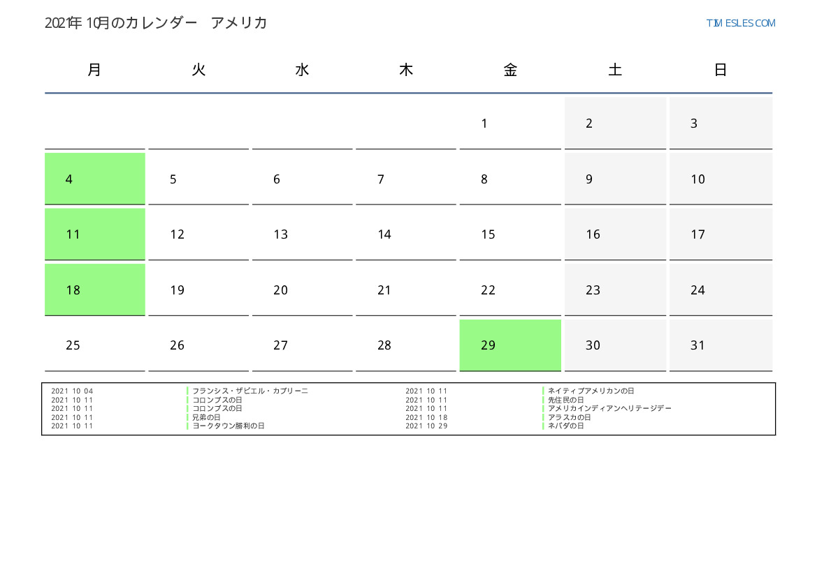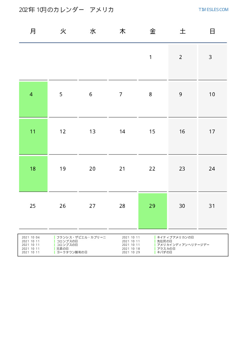 米国向け2021年10月の休日と週末のPDFカレンダーをダウンロードして印刷します