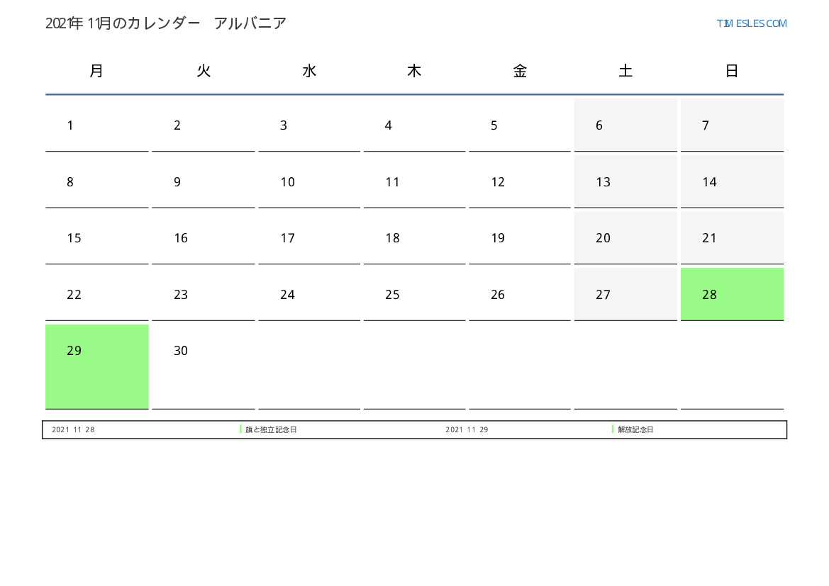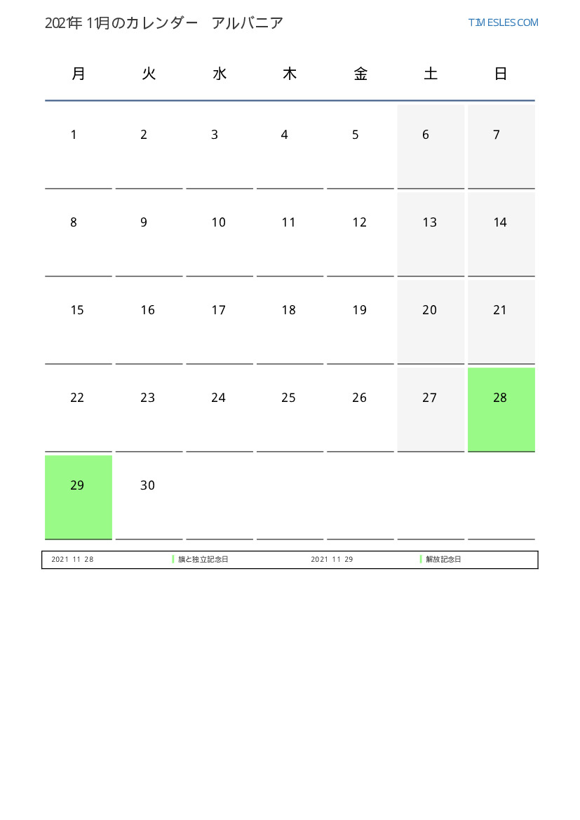 アルバニアの場合2021年11月の休日と週末のカレンダー