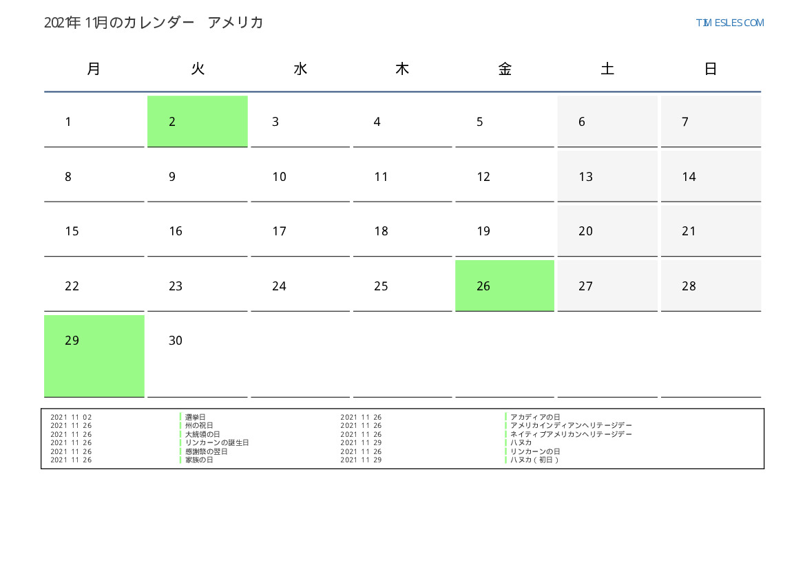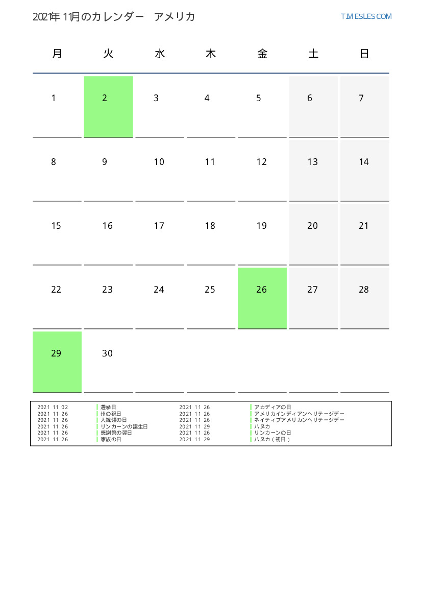 11月には30日が含まれます。 これは2021年の11か月です。一年の季節:秋。 11月は月曜日に始まり、火曜日に終わります。 2021年11月、アメリカ合衆国では43 休日と休日があります。