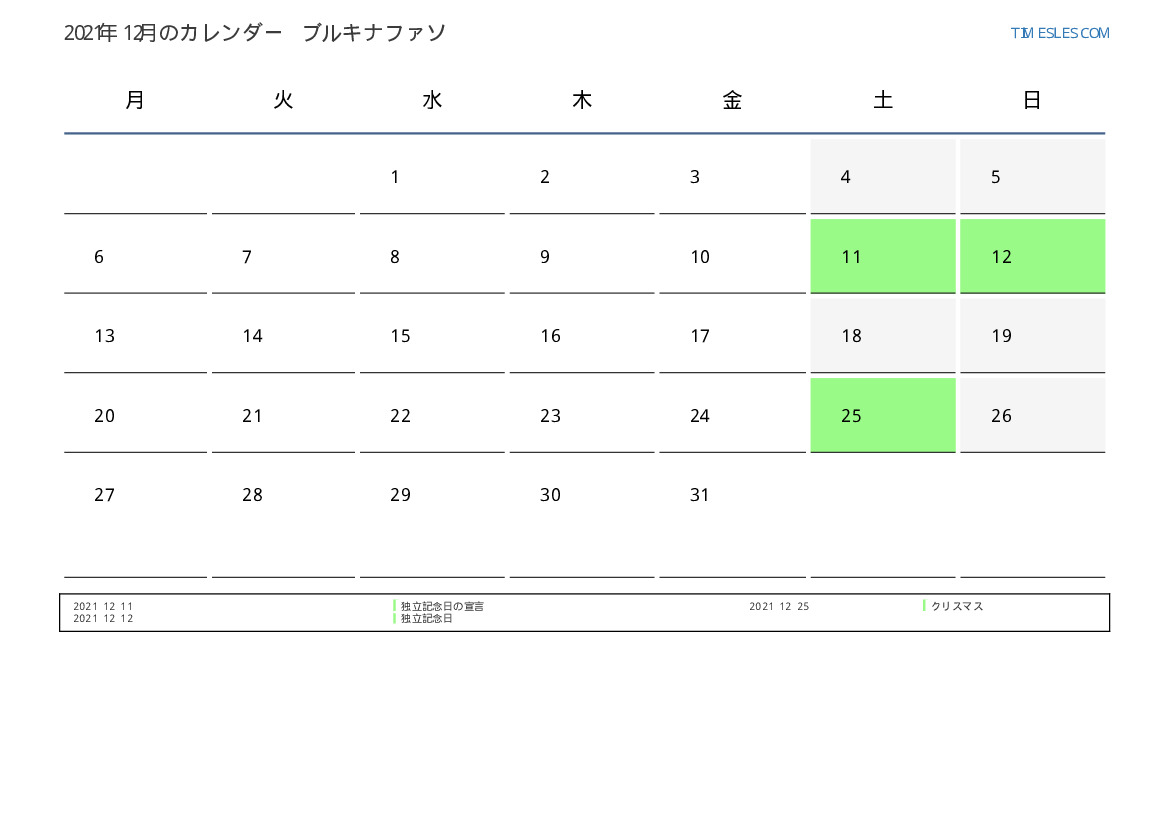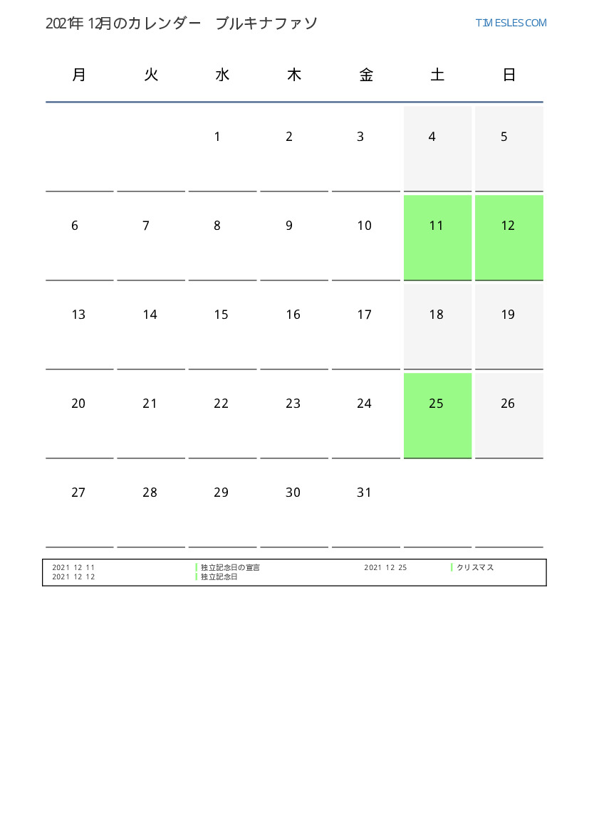 ブルキナファソ2021年12月の休日と週末のカレンダー