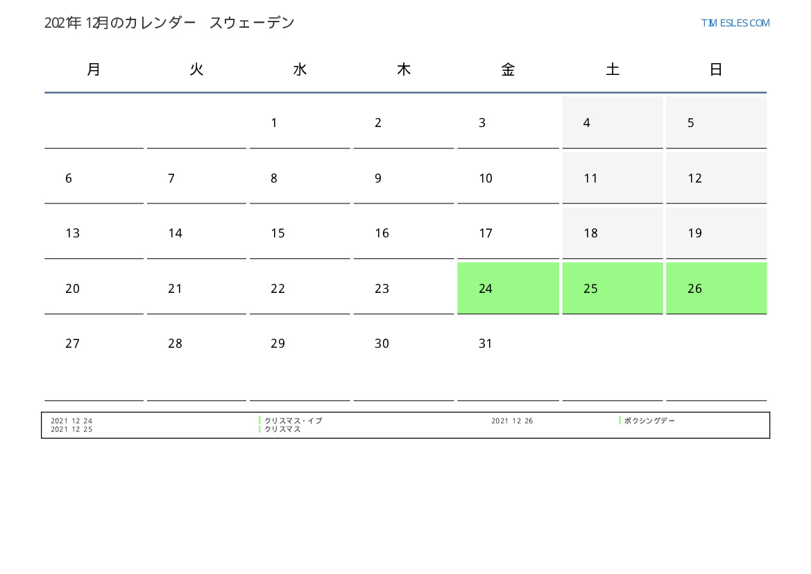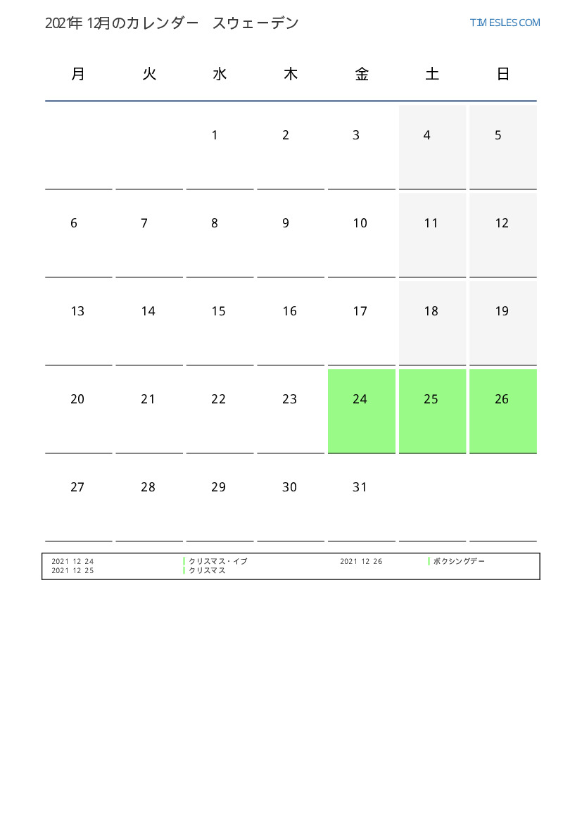スウェーデン向け2021年12月の休日と週末のカレンダー