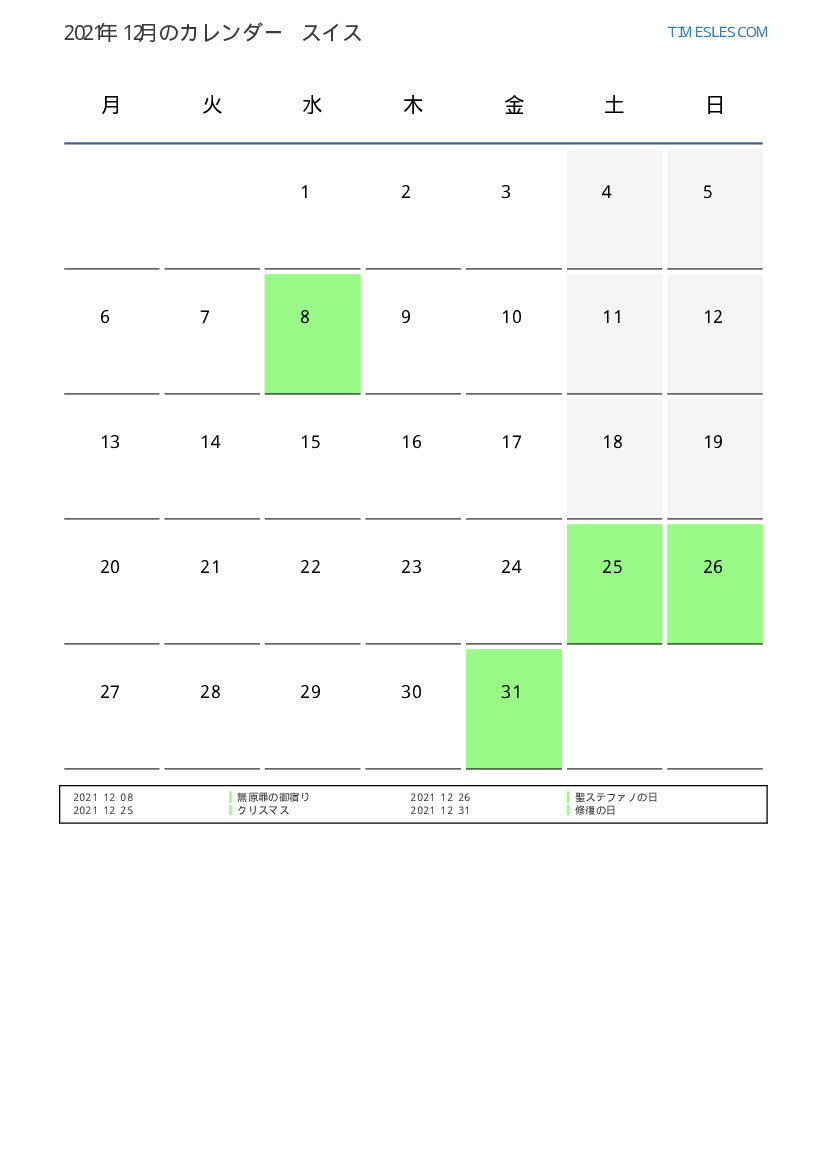 スイス向け2021年12月の休日と週末のカレンダー