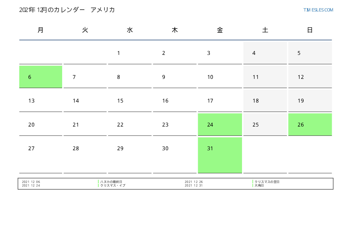 米国向け2021年12月の休日と週末のカレンダー