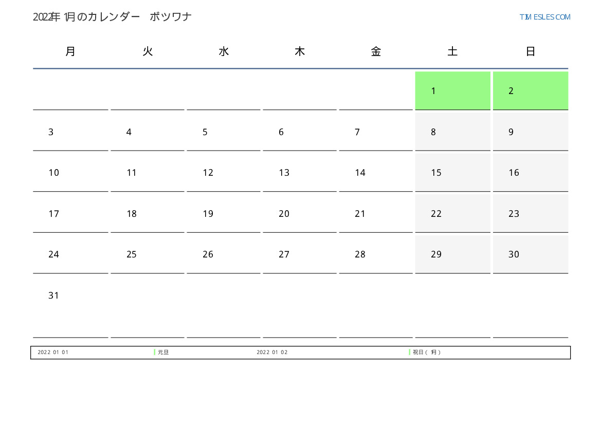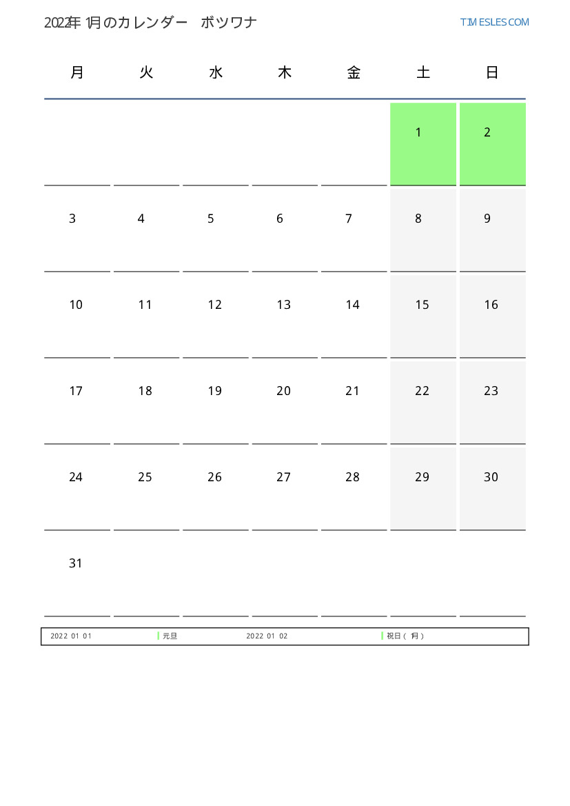 ボツワナ向け2022年1月の休日と週末のカレンダー