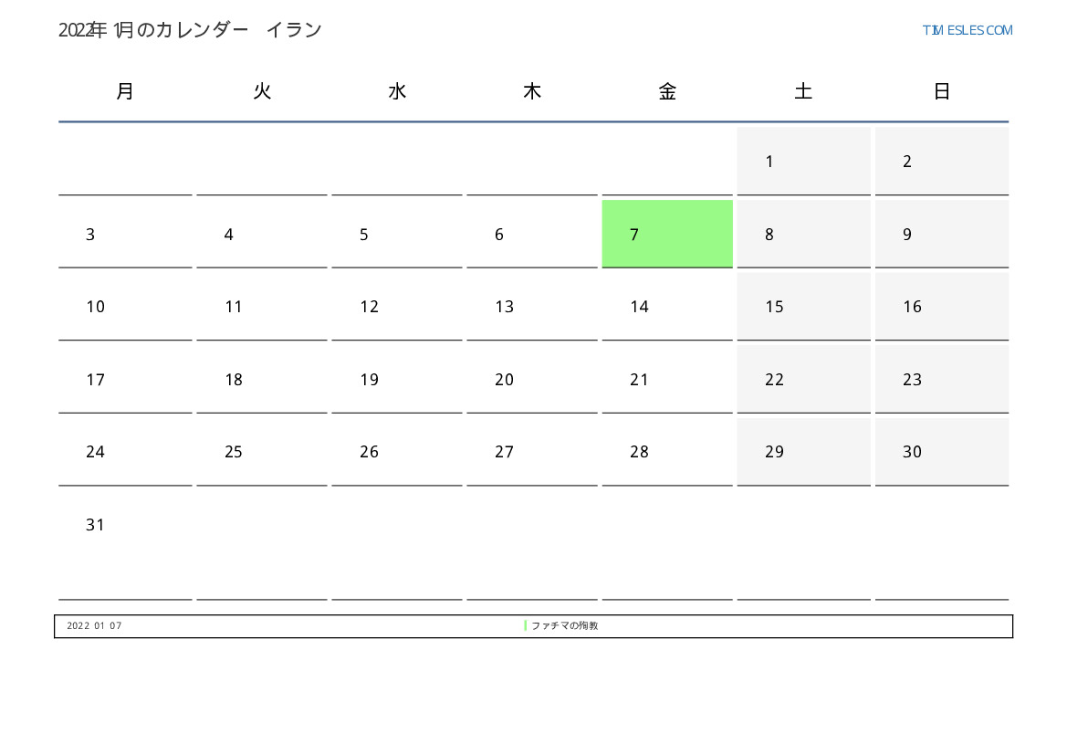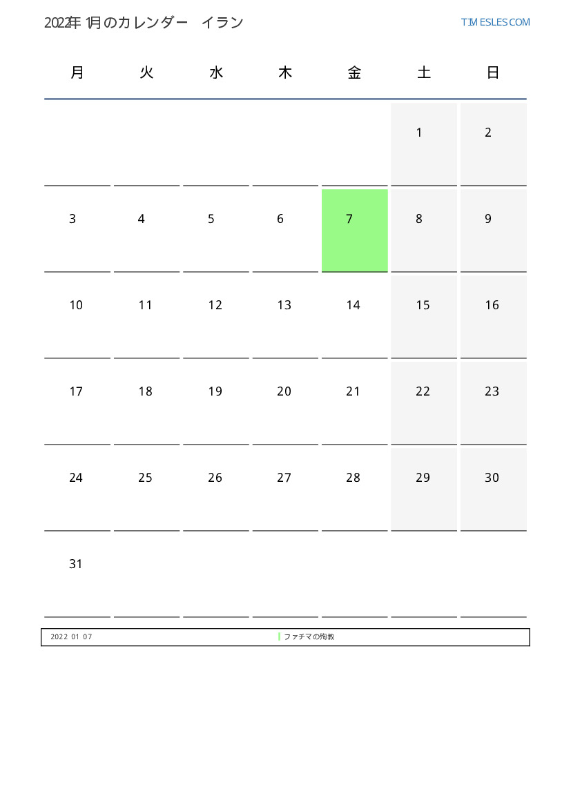 イランのために2022年1月の休日と週末のPDFカレンダーをダウンロードして印刷します