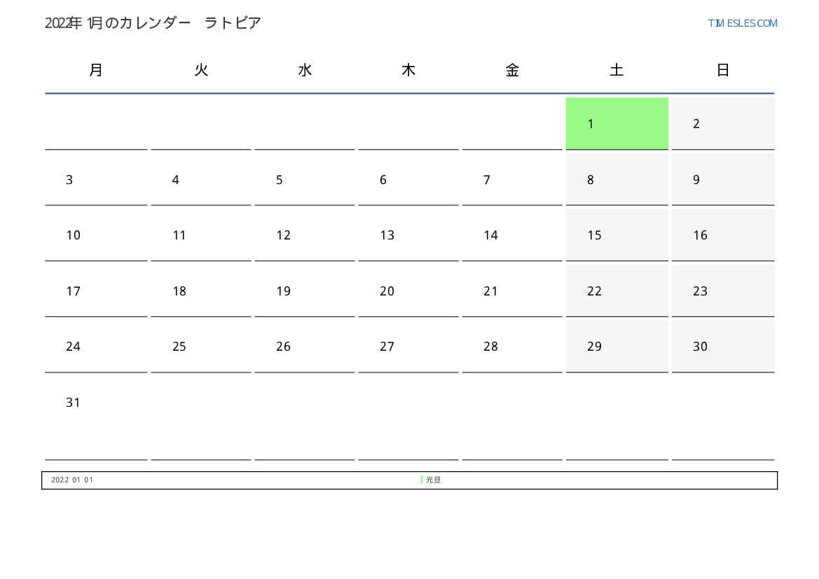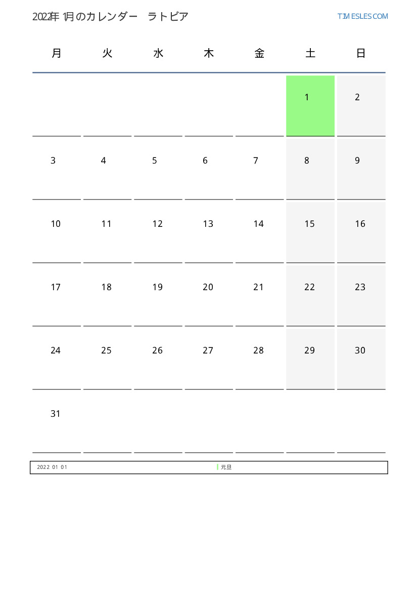 ラトビア向け2022年1月の休日と週末のカレンダー