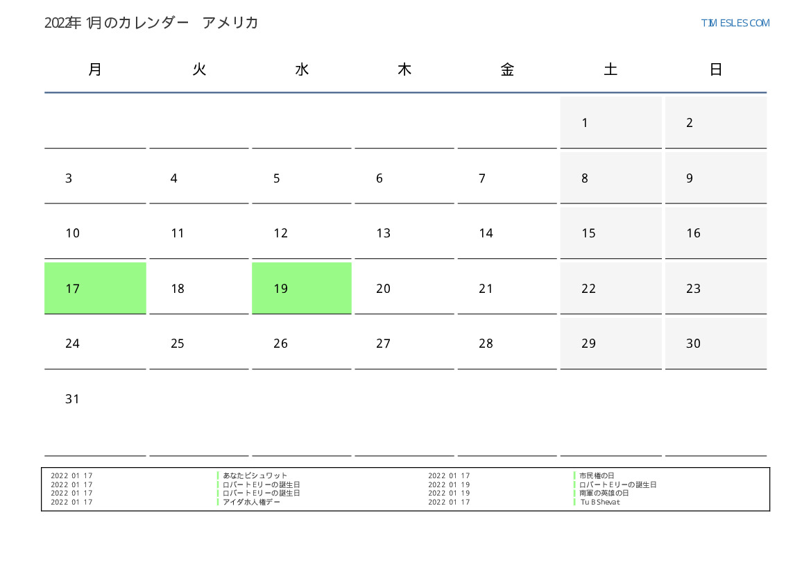 米国向け2022年1月の休日と週末のカレンダー