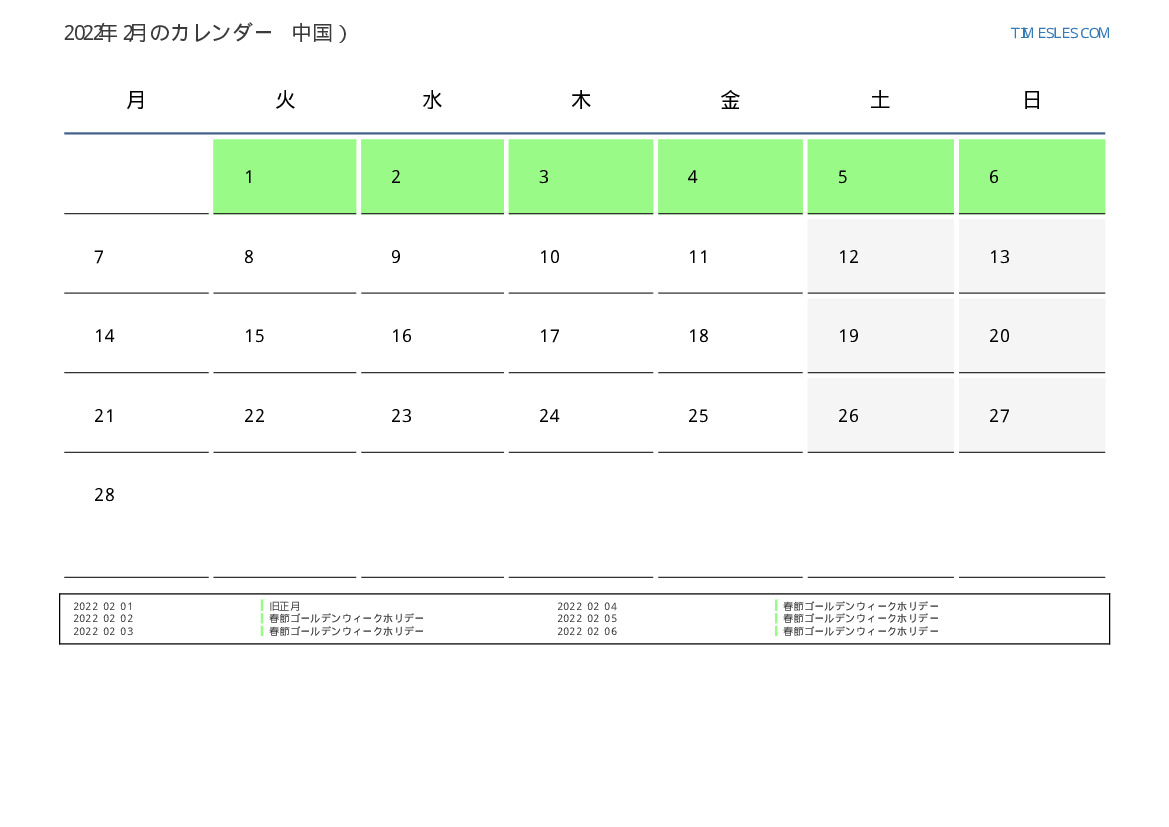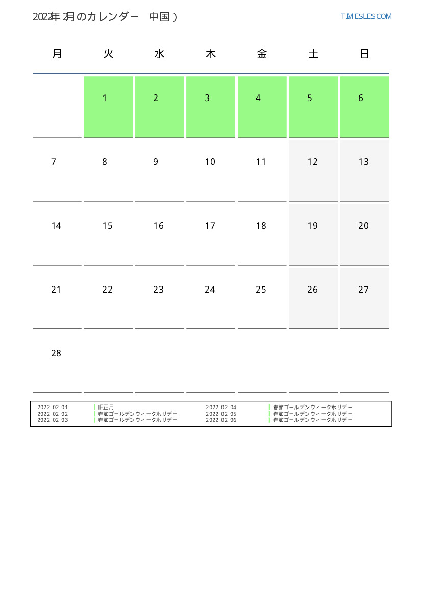 中国向け2022年2月の休日と週末のPDFカレンダーをダウンロードして印刷します