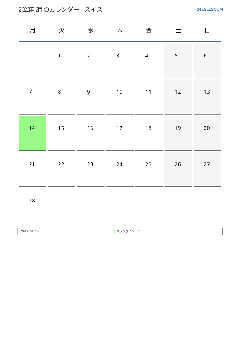 スイス向け2022年2月の休日と週末のPDFカレンダーをダウンロードして印刷します