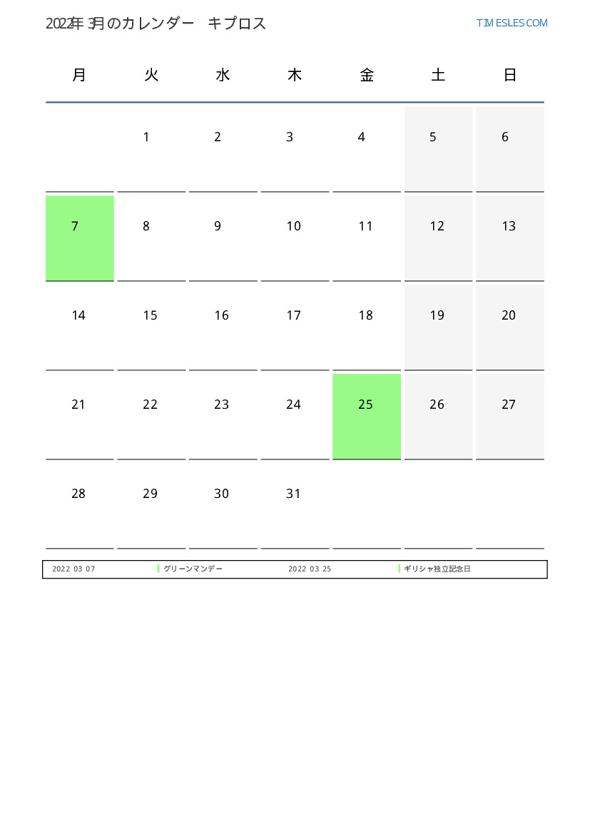3月には31日が含まれます。 これは2022年の3か月です。一年の季節:春。 3月は火曜日に始まり、木曜日に終わります。 2022年3月、キプロスで4 休日と休日があります。