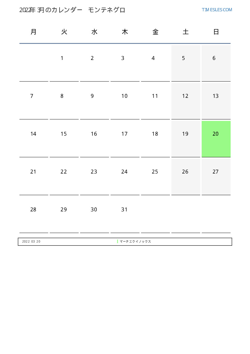 モンテネグロ向け2022年3月の休日と週末のカレンダー