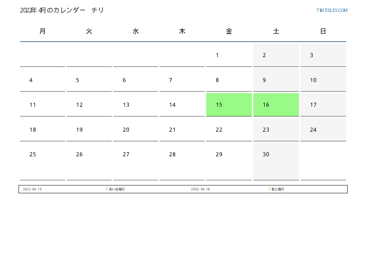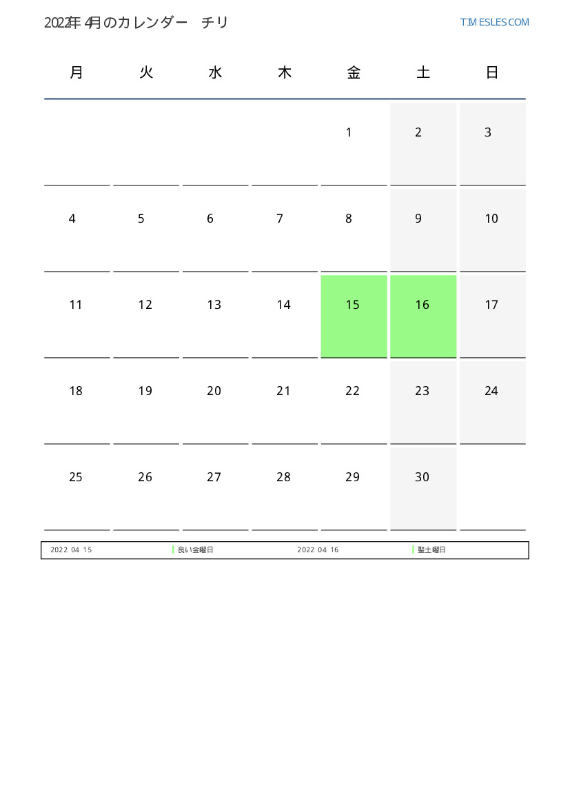 4月には30日が含まれます。 これは2022年の4か月です。一年の季節:春。 4月は金曜日に始まり、土曜日終わります。 2022年4月、チリで4 休日と休日があります。