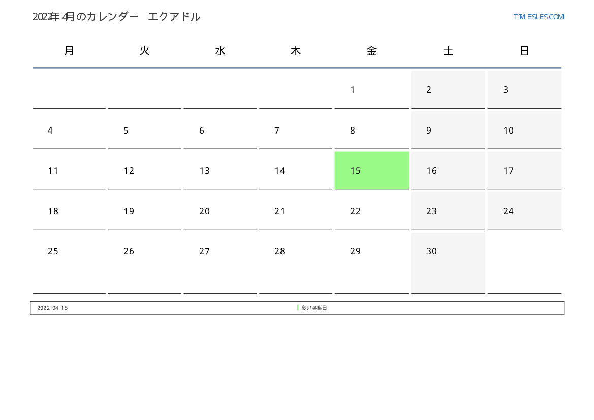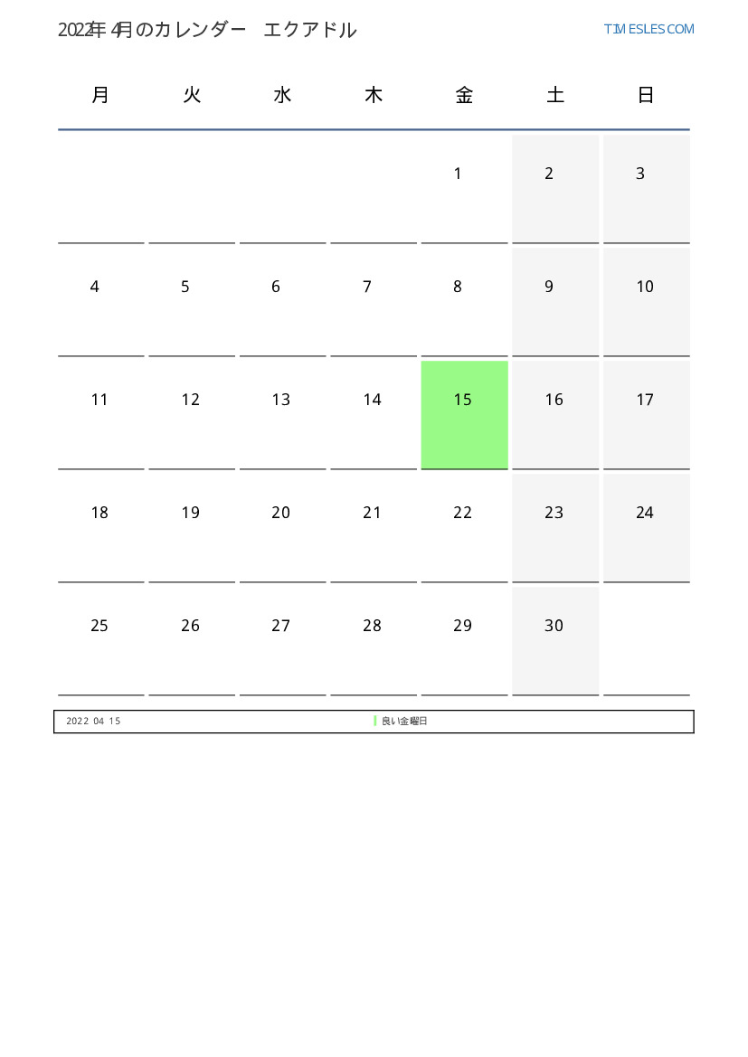 エクアドル向け2022年4月の休日と週末のカレンダー