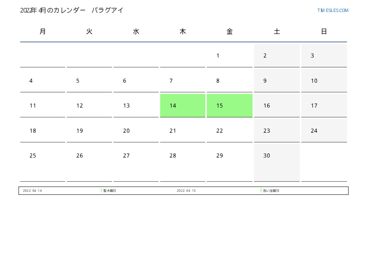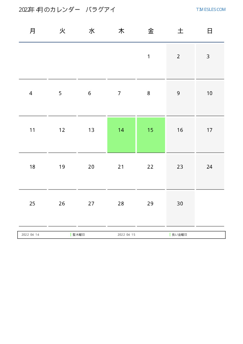 パラグアイ向け2022年4月の休日と週末のカレンダー