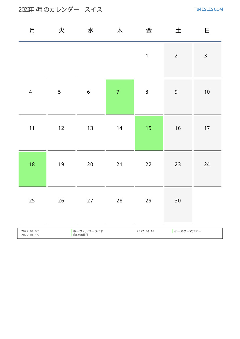 スイス向け2022年4月の休日と週末のカレンダー