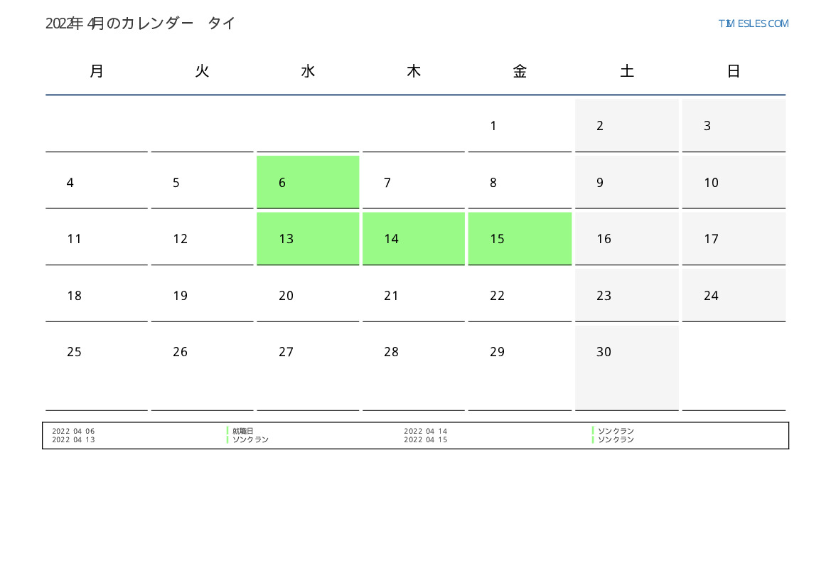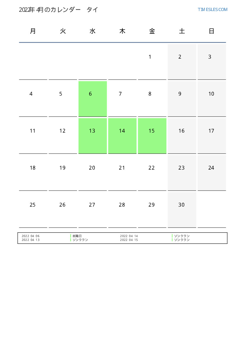 4月には30日が含まれます。 これは2022年の4か月です。一年の季節:春。 4月は金曜日に始まり、土曜日終わります。 2022年4月、タイで4 休日と休日があります。