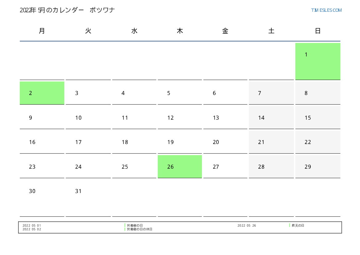 ボツワナ向け2022年5月の休日と週末のカレンダー