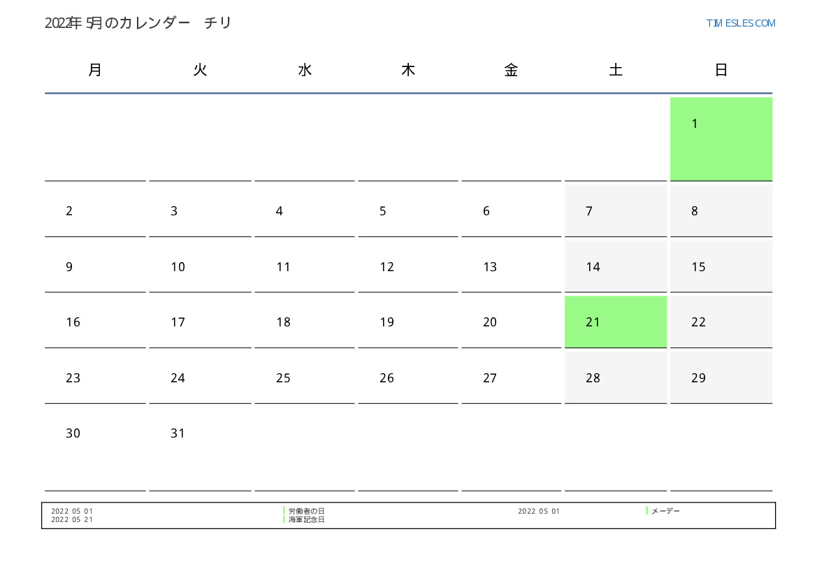 5月には31日が含まれます。 これは2022年の5か月です。一年の季節:春。 5月は日曜日に始まり、火曜日に終わります。 2022年5月、チリで3 休日と休日があります。
