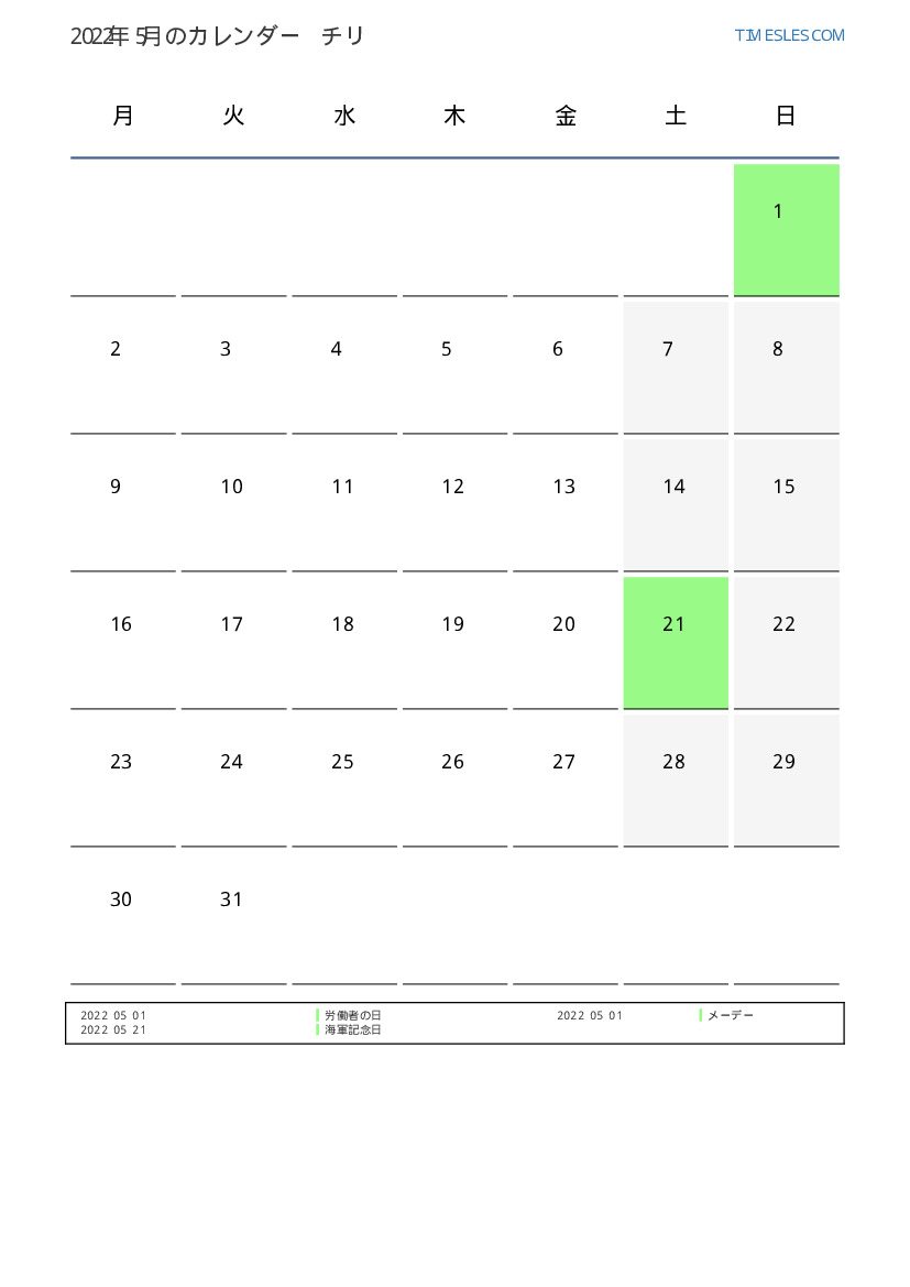 チリ向け2022年5月の休日と週末のPDFカレンダーをダウンロードして印刷します