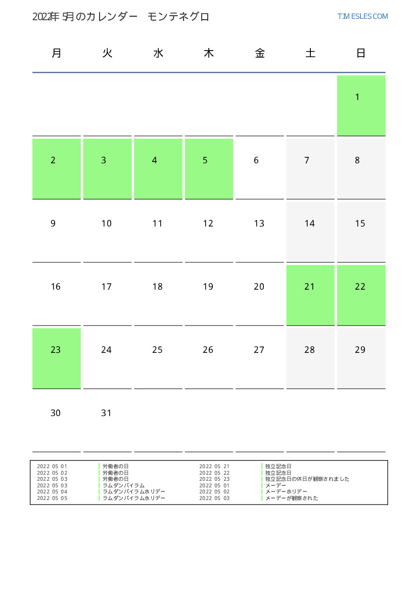 モンテネグロ向け2022年5月のカレンダー