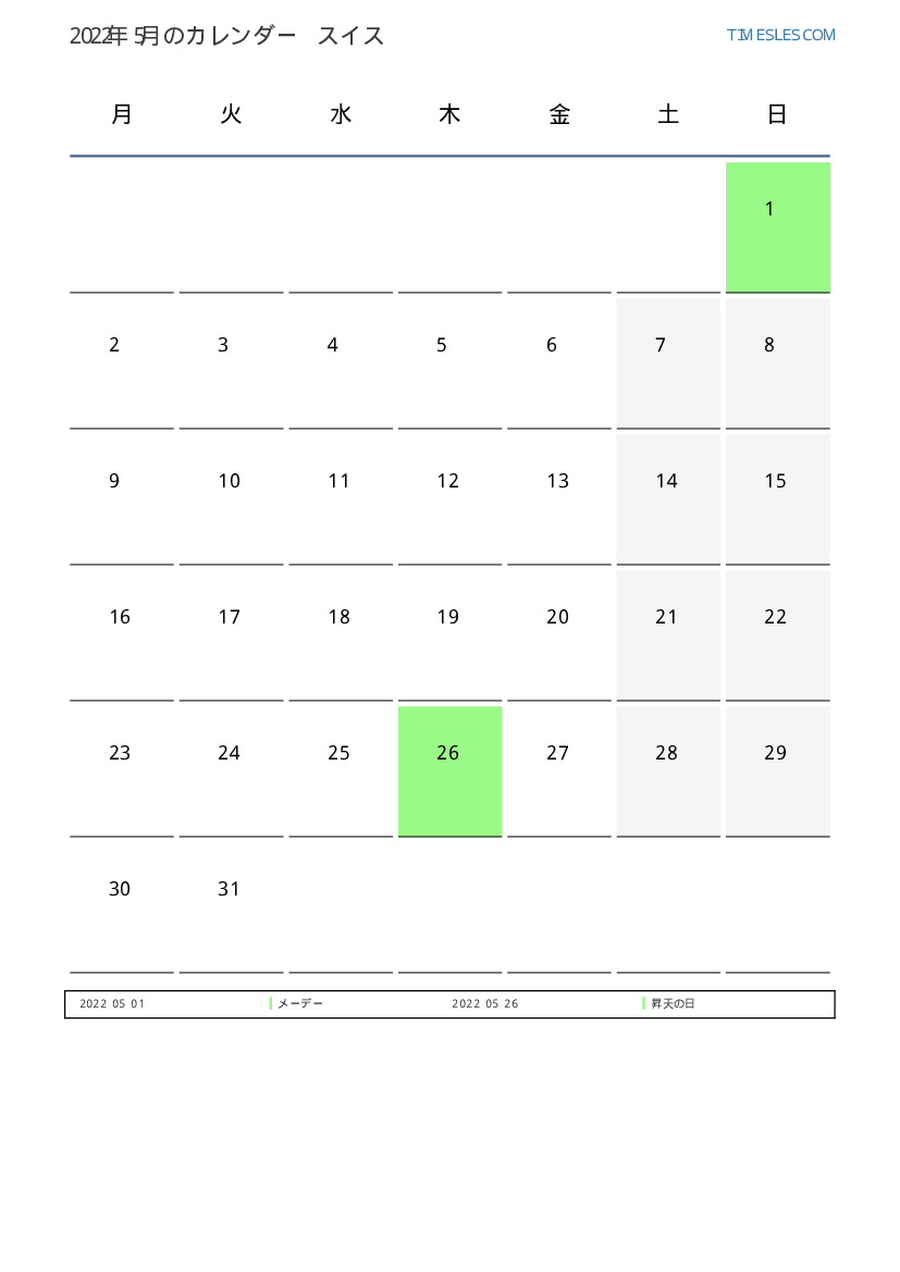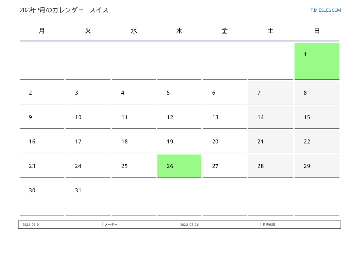 スイス向け2022年5月の休日と週末のPDFカレンダーをダウンロードして印刷します