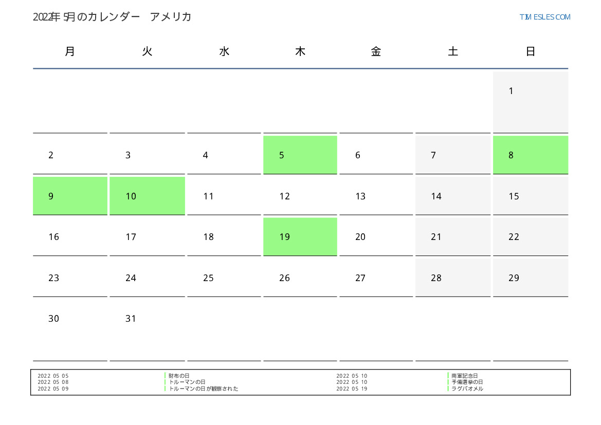米国向け2022年5月のカレンダー