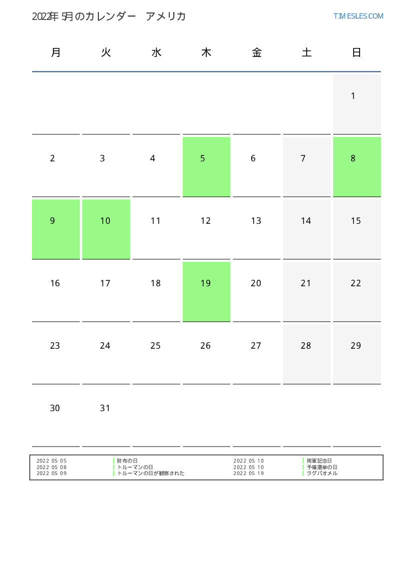 米国向け2022年5月の休日と週末のカレンダー