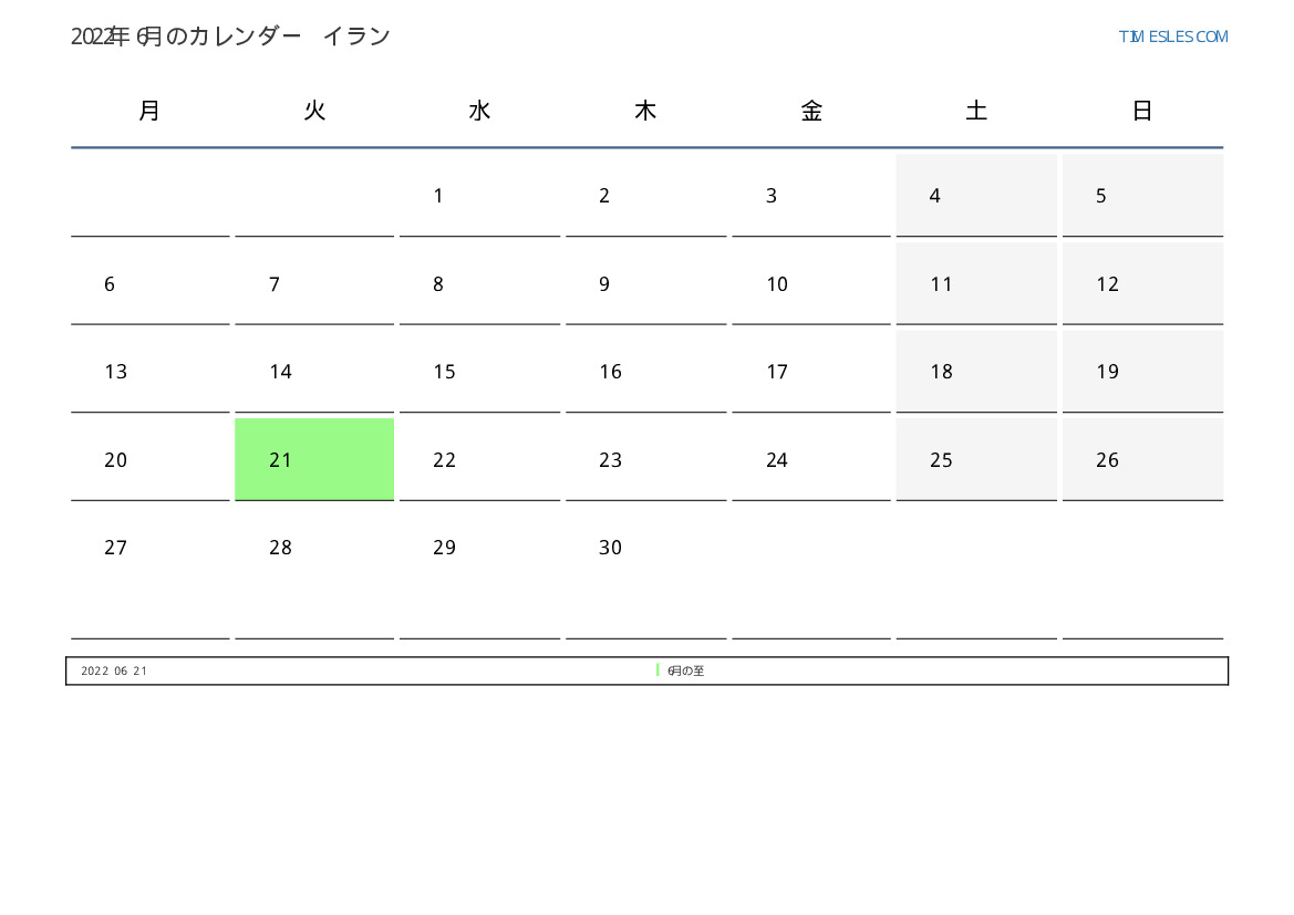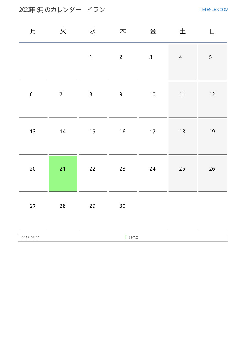 イランのために2022年6月の休日と週末のPDFカレンダーをダウンロードして印刷します