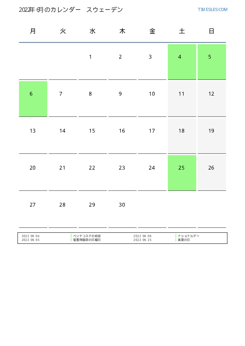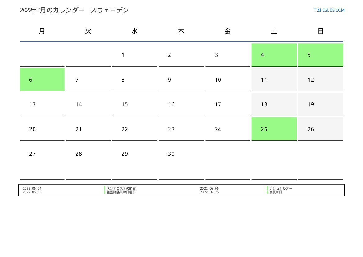 スウェーデン向け2022年6月のカレンダー