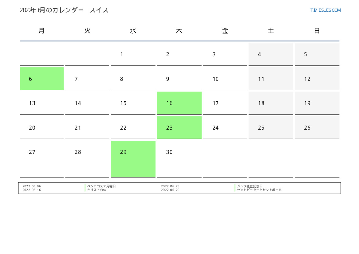 スイス向け2022年6月の休日と週末のPDFカレンダーをダウンロードして印刷します