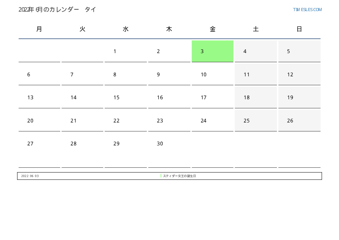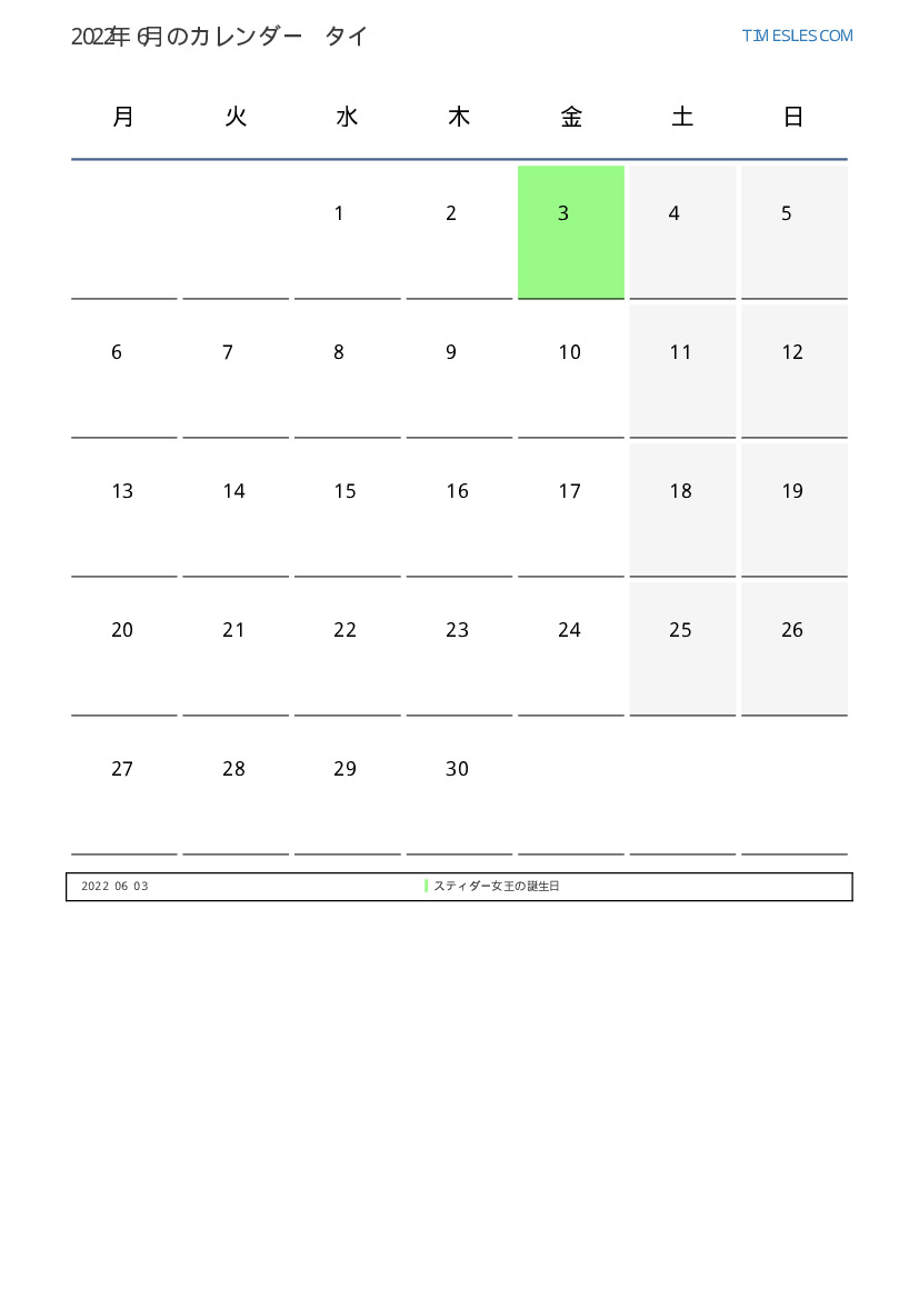 タイ向け2022年6月の休日と週末のカレンダー