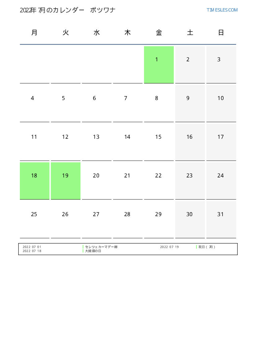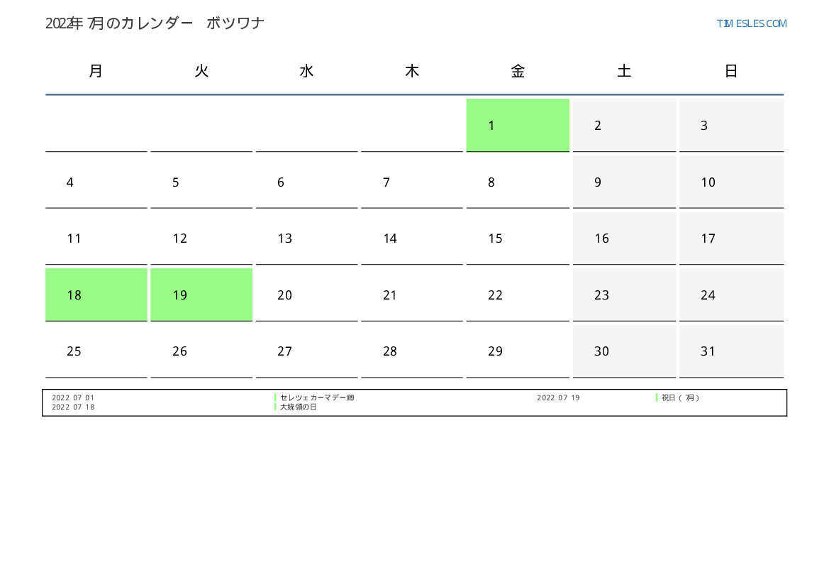 ボツワナ向け2022年7月の休日と週末のカレンダー