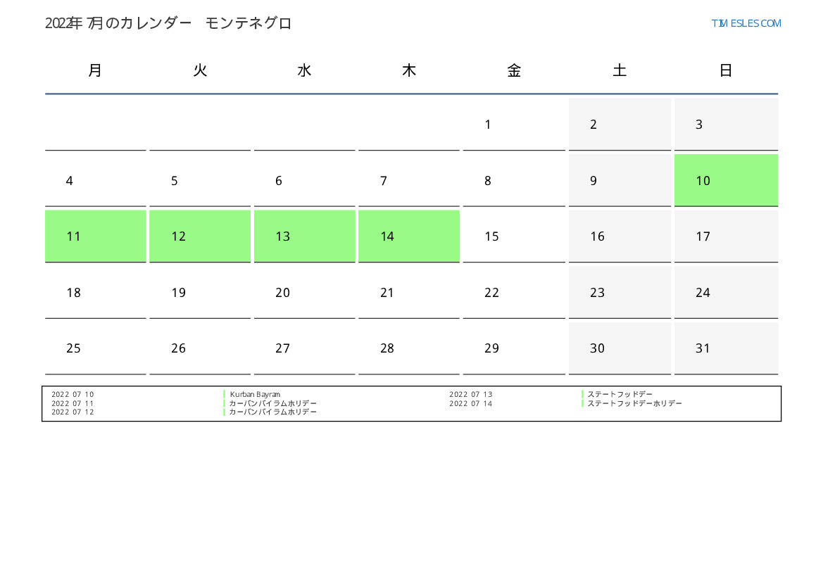 モンテネグロ向け2022年7月の休日と週末のカレンダー