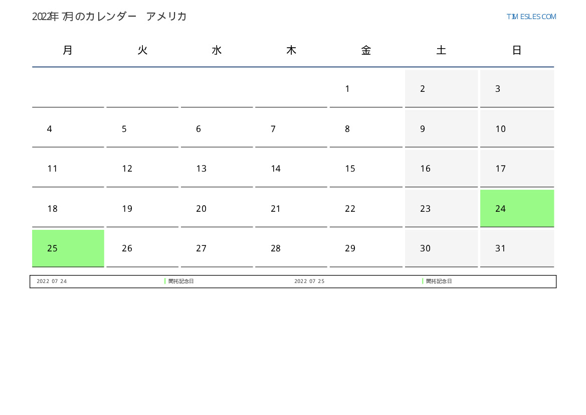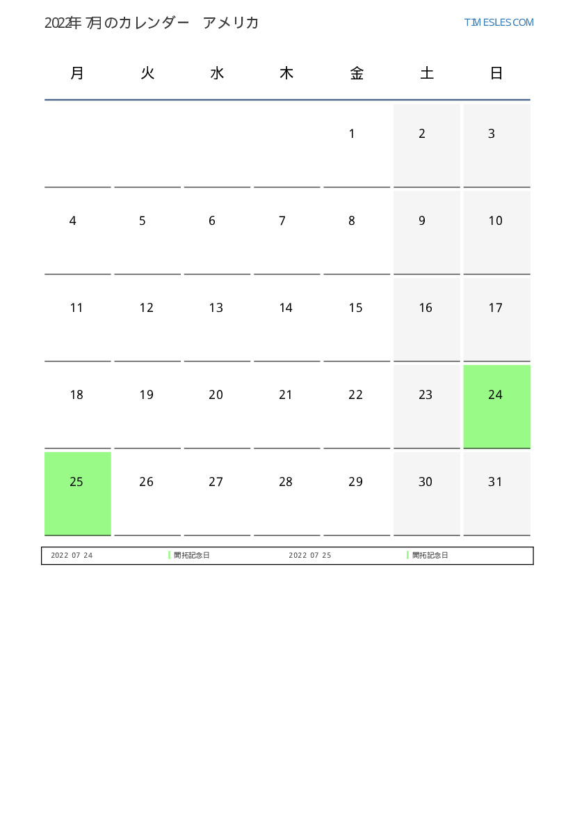 米国向け2022年7月の休日と週末のカレンダー
