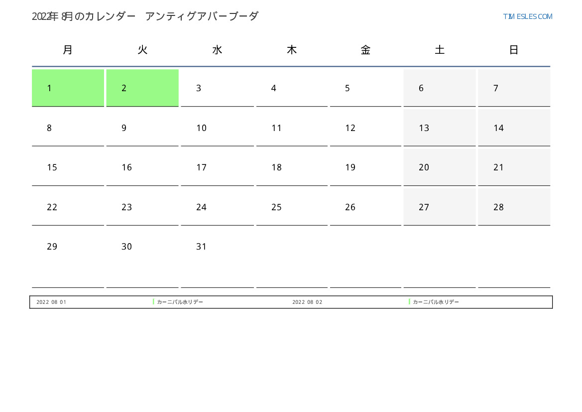 アンティグアバーブーダ2022年8月の休日と週末のカレンダー