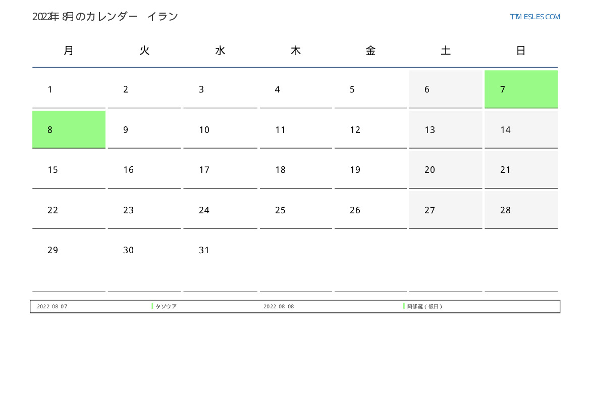 イランのために2022年8月の休日と週末のPDFカレンダーをダウンロードして印刷します