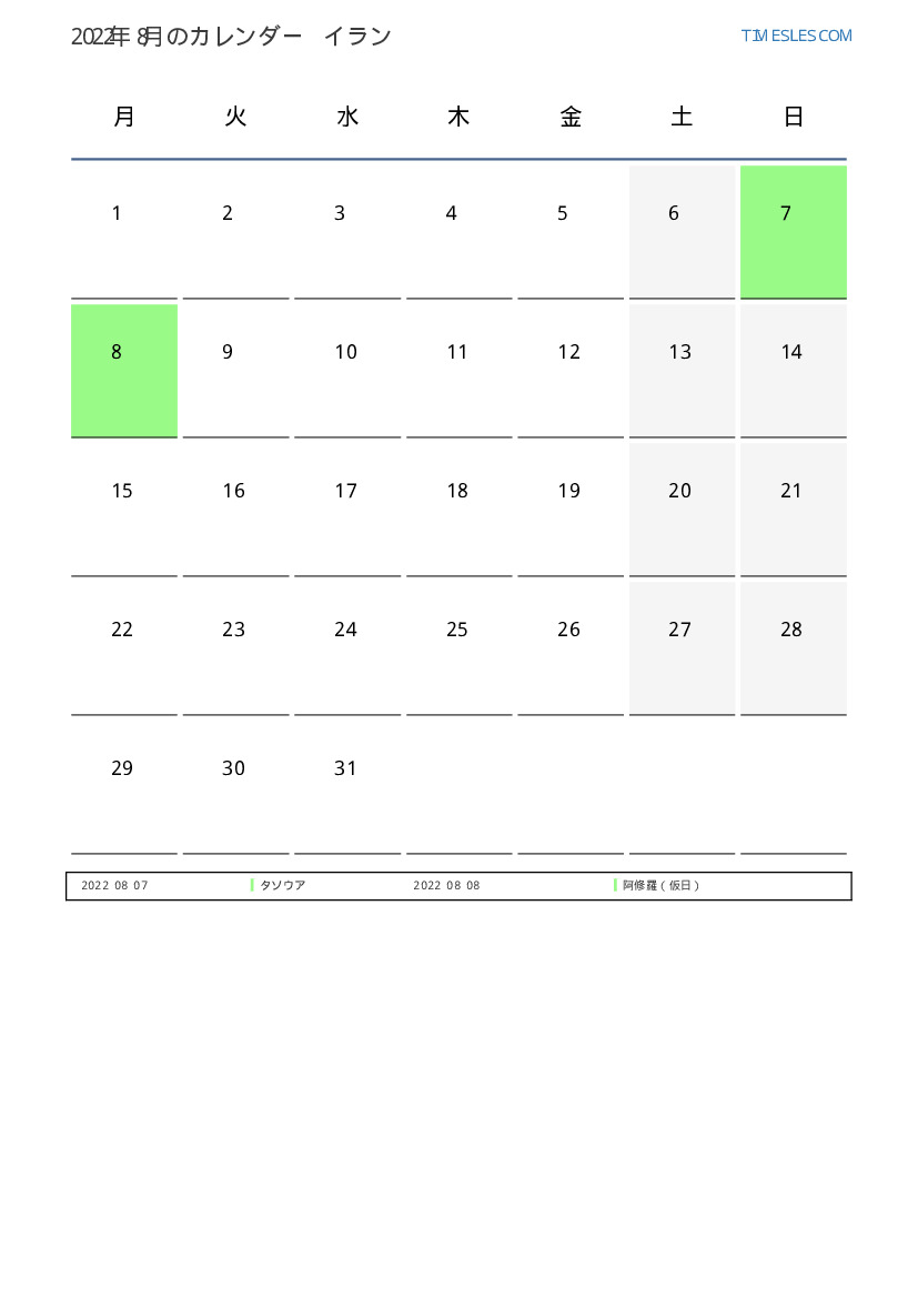 8月には31日が含まれます。 これは2022年の8か月です。一年の季節:夏。 8月は月曜日に始まり、水曜日に終わります。 2022年8月、イランで2 休日と休日があります。