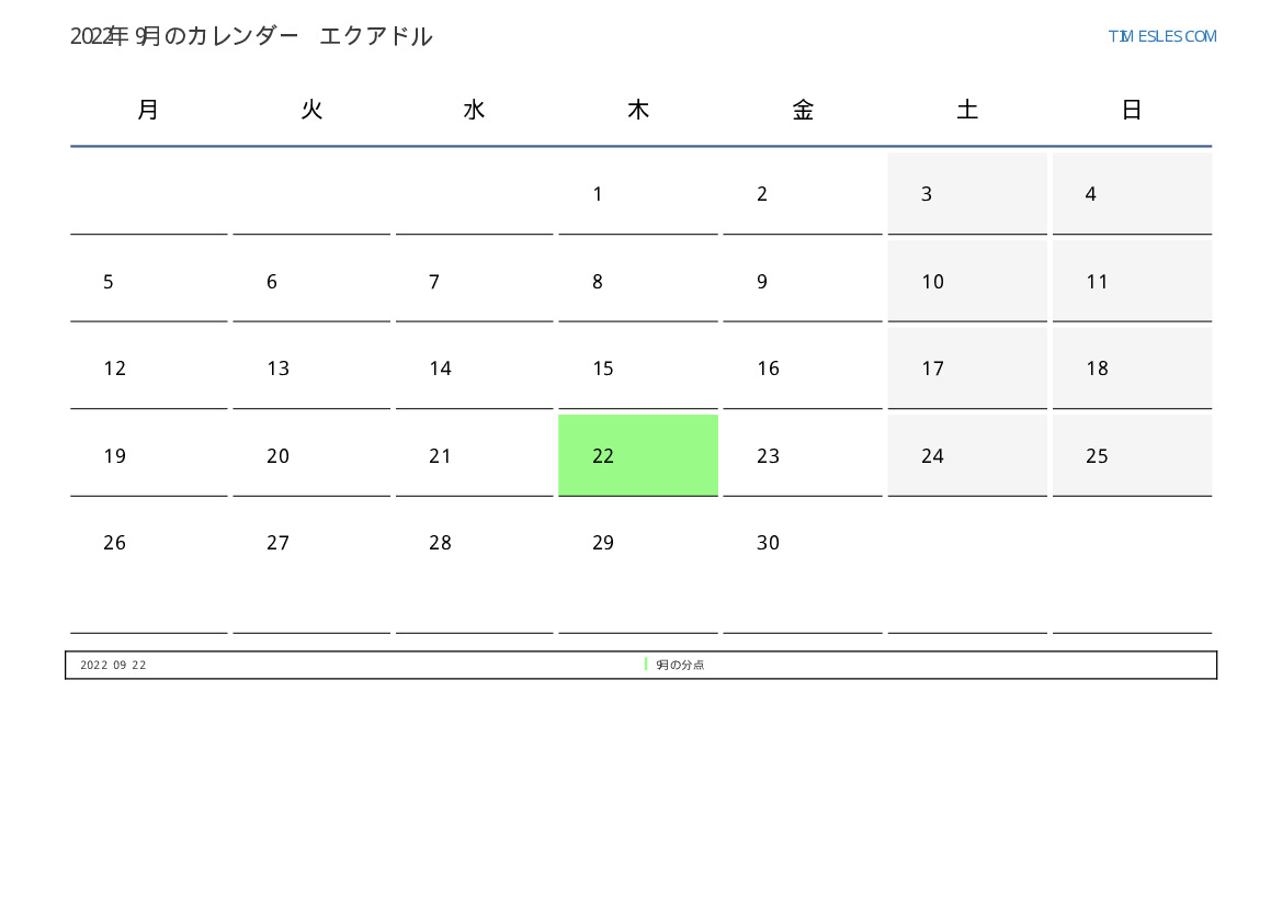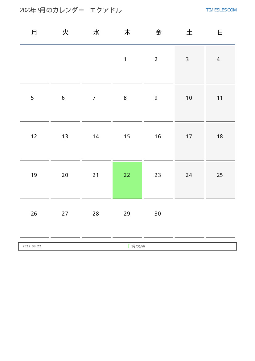 エクアドル向け2022年9月の休日と週末のカレンダー