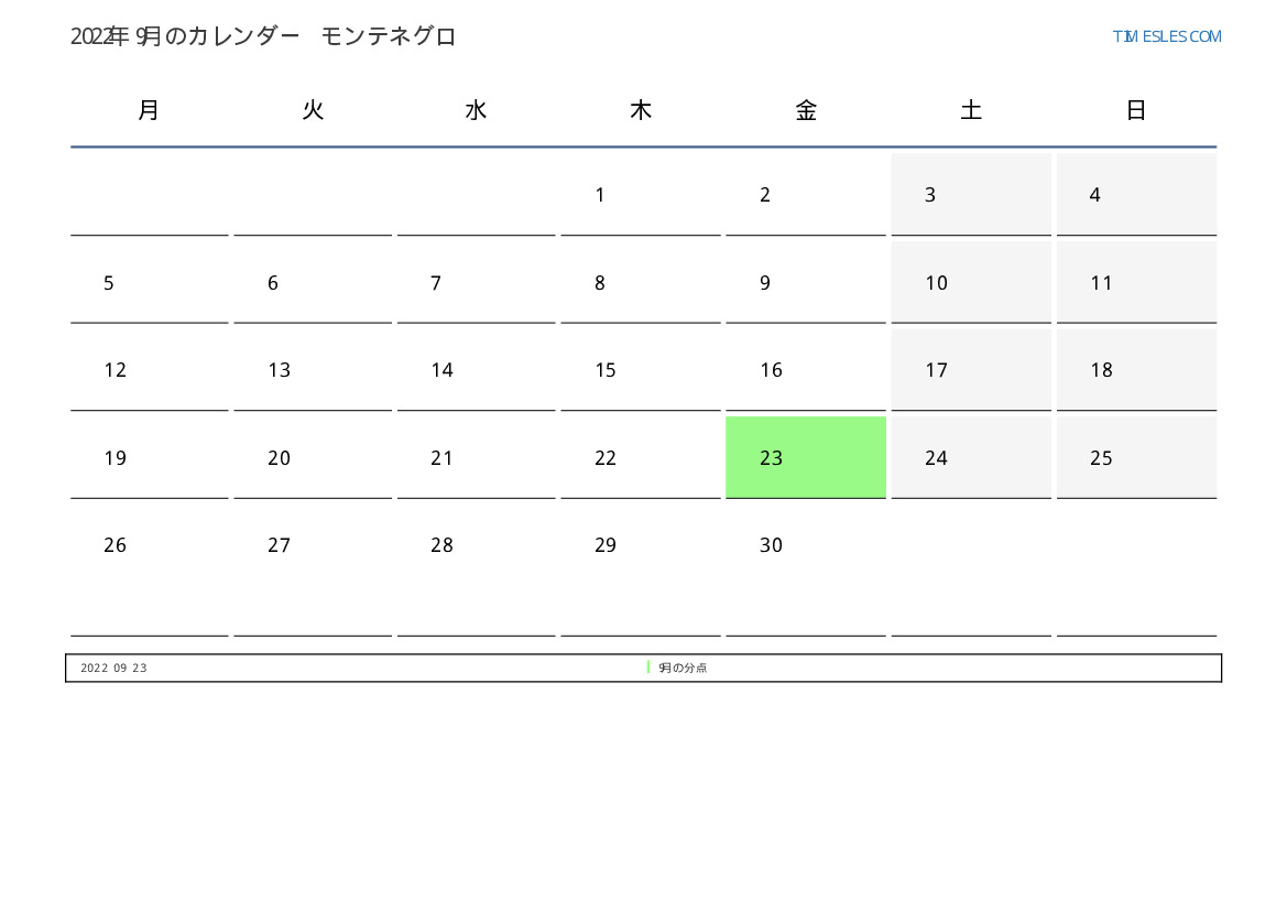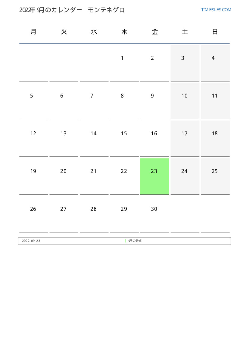 モンテネグロ向け2022年9月の休日と週末のカレンダー