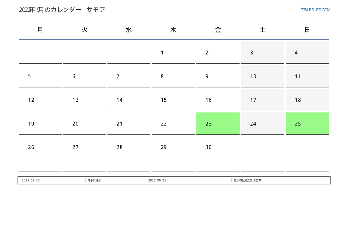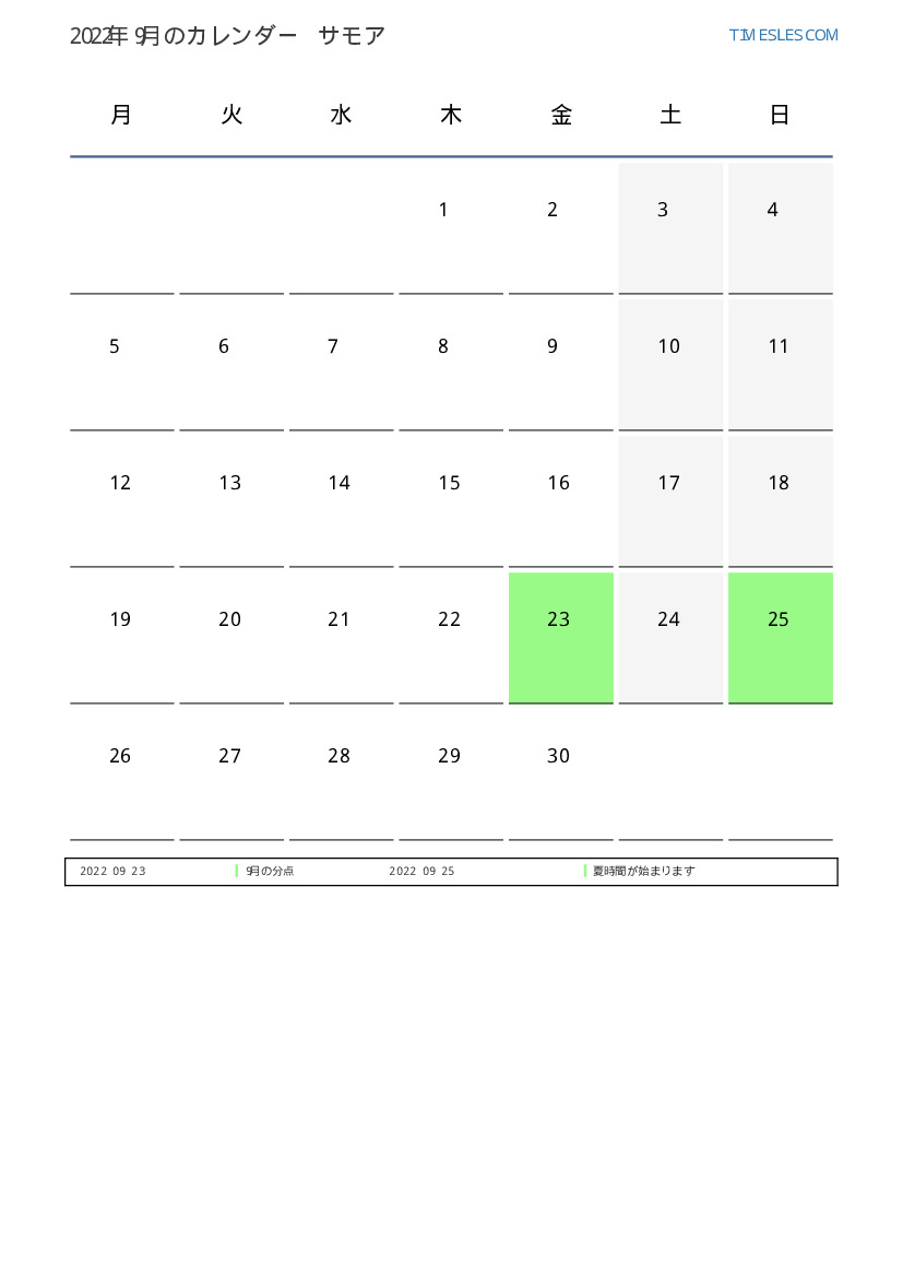 サモアのために2022年9月の休日と週末のPDFカレンダーをダウンロードして印刷します