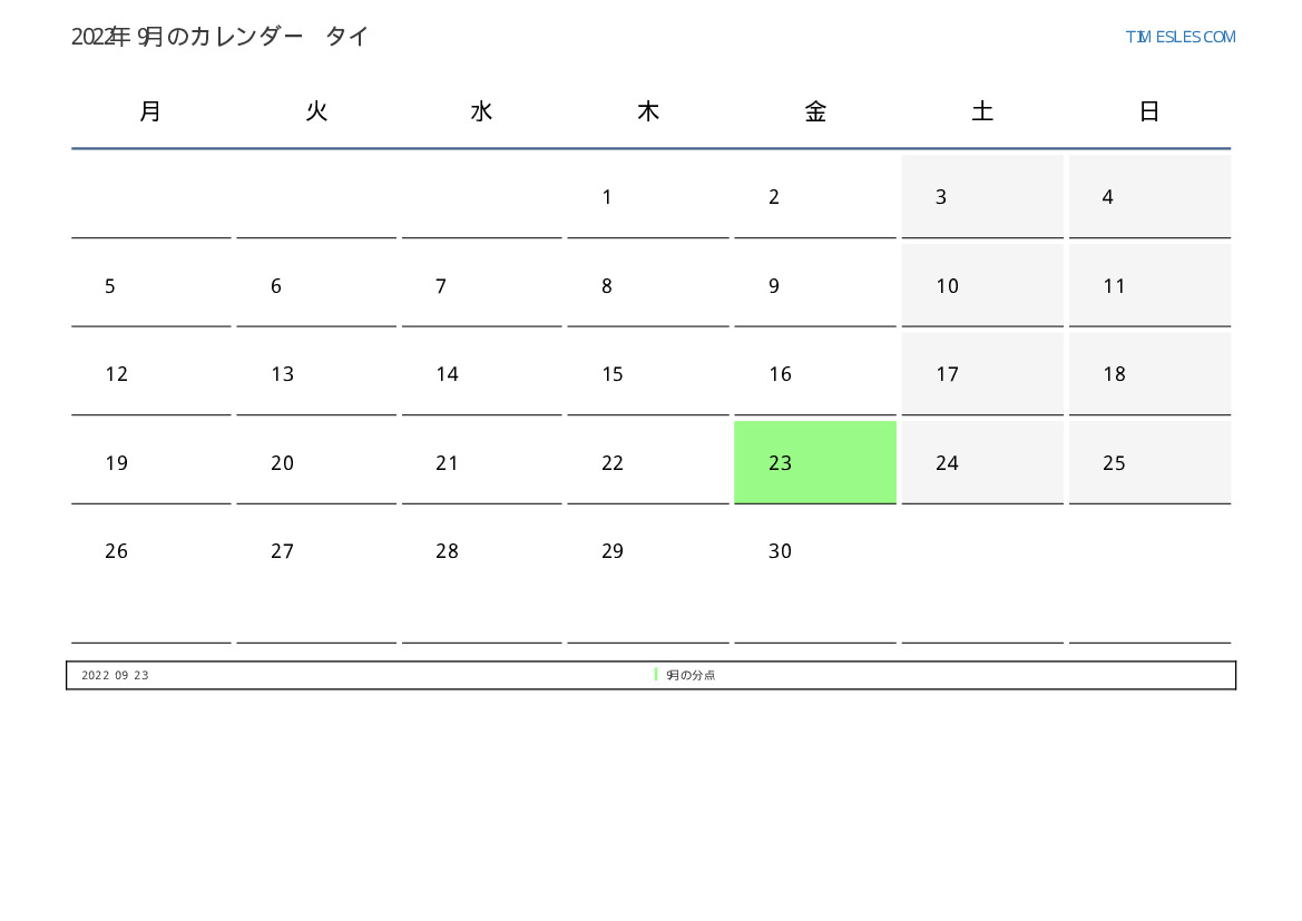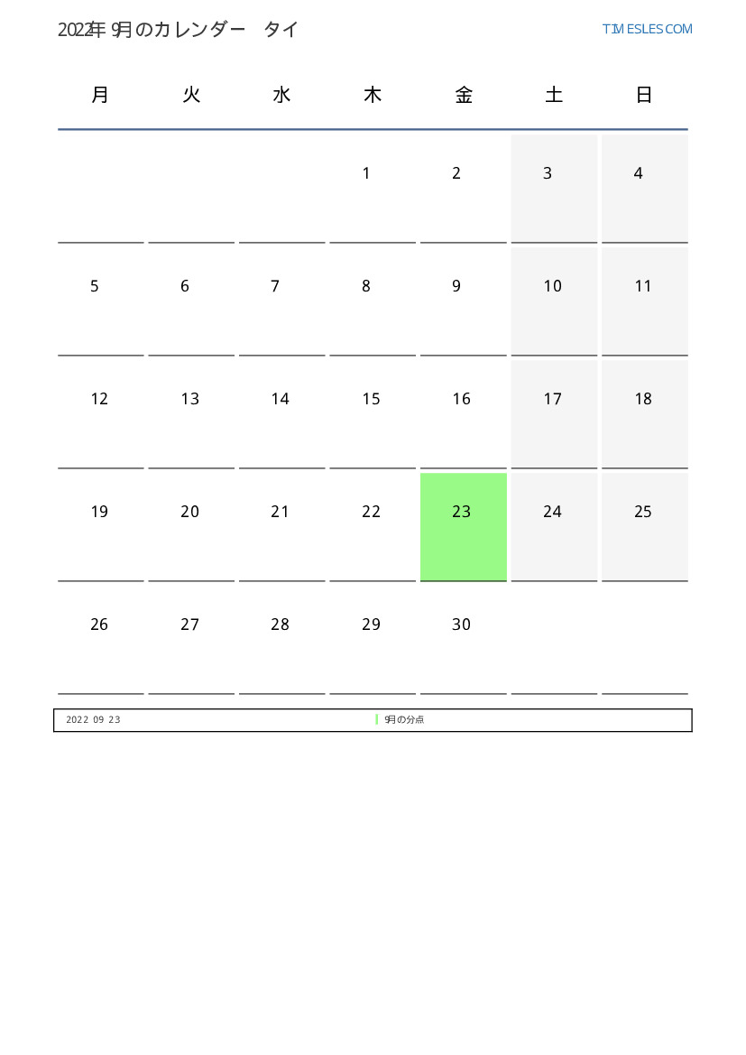 タイ向け2022年9月の休日と週末のPDFカレンダーをダウンロードして印刷します