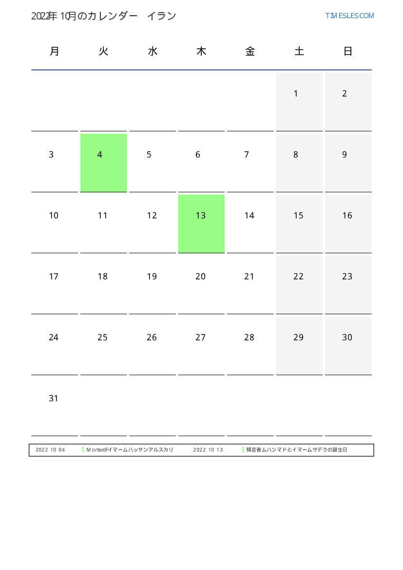 イランのために2022年10月の休日と週末のPDFカレンダーをダウンロードして印刷します