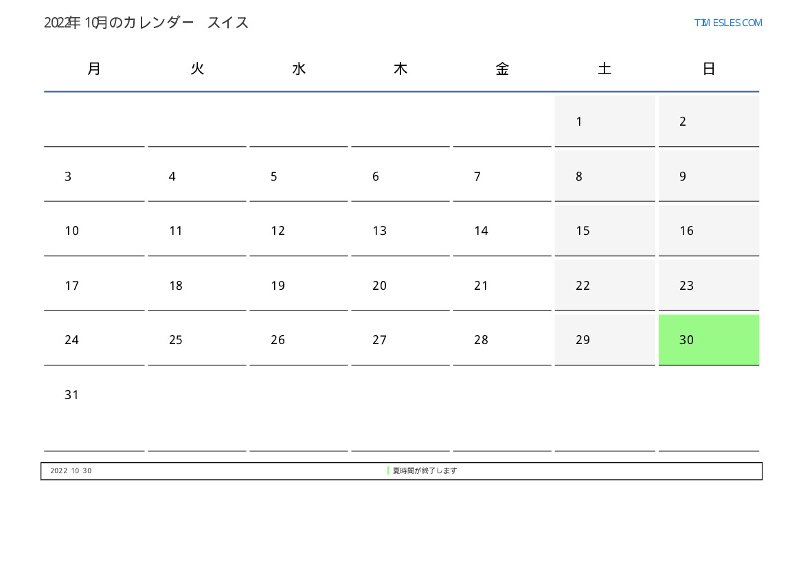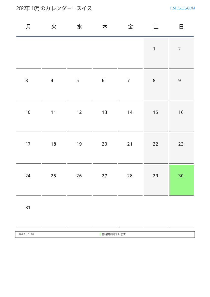 スイス向け2022年10月の休日と週末のPDFカレンダーをダウンロードして印刷します